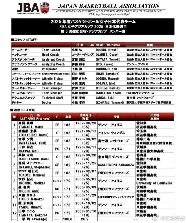 日本女篮公布的女篮亚洲杯12人名单如下: